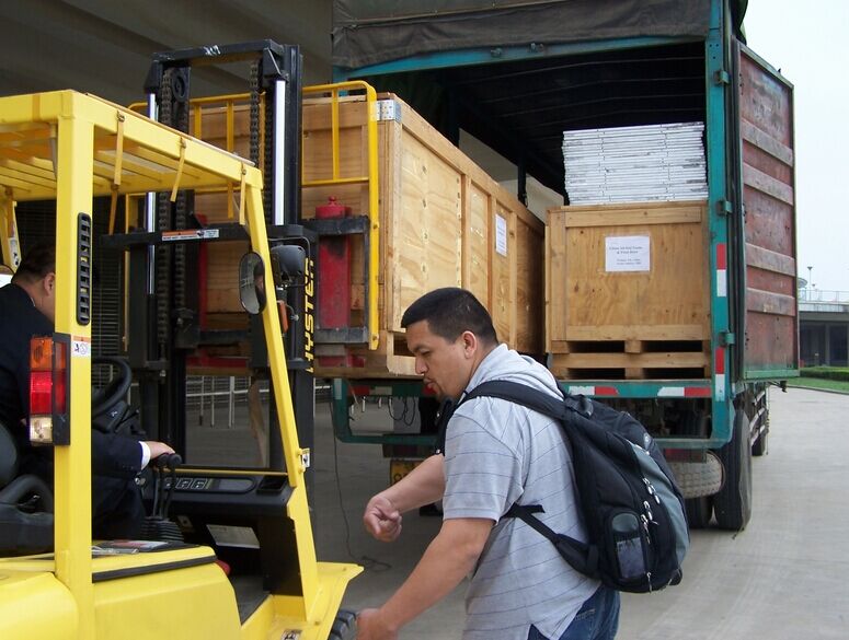 4、最后將風(fēng)淋室裝訂于木箱中,用吊車叉起送入運輸工具去。