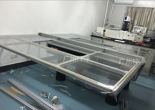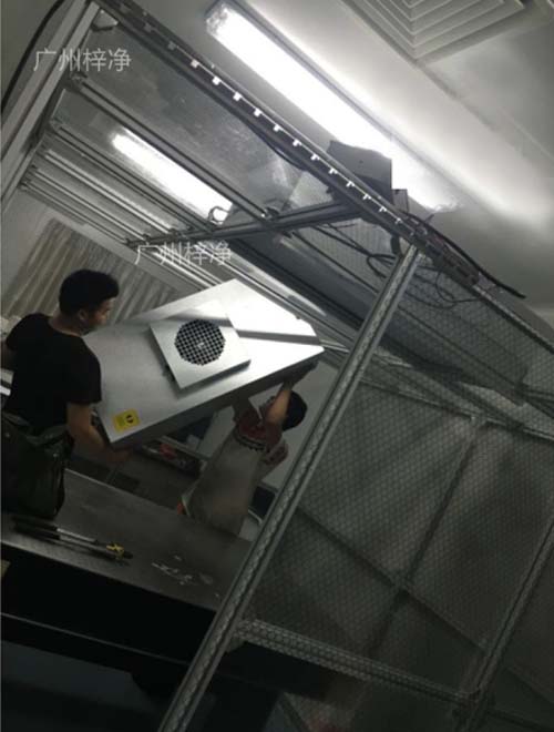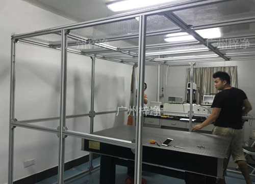 材料以鋼方通噴塑作為框架,采用風(fēng)機(jī)濾網(wǎng)機(jī)組FFU送風(fēng),凈化棚四周圍用防靜電垂簾,頂部鋪蓋密縫盲板,形成一個(gè)密縫區(qū),內(nèi)部凈化級別可達(dá)10—100000級;特別適用于車間內(nèi)局部凈化級別要求高的區(qū)域,如流水線作業(yè)區(qū)域。高精確度產(chǎn)品組裝區(qū)。技術(shù)人員正在安裝千級潔凈棚千級潔凈棚|1000級潔凈棚特點(diǎn):